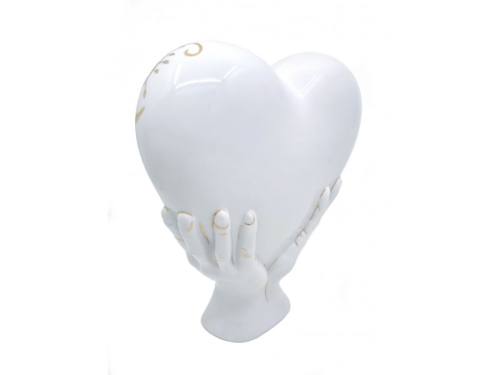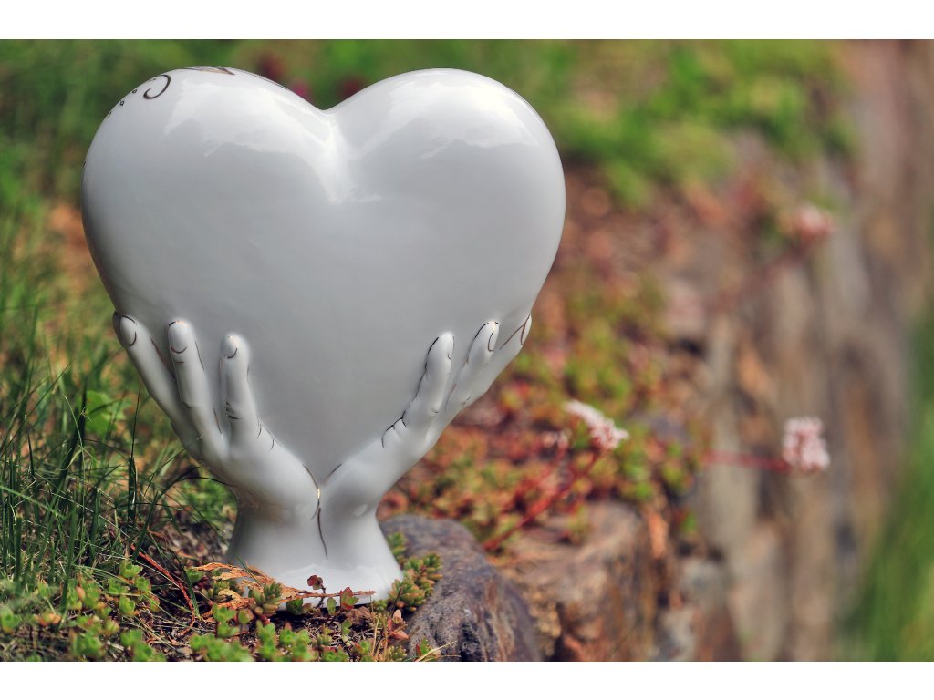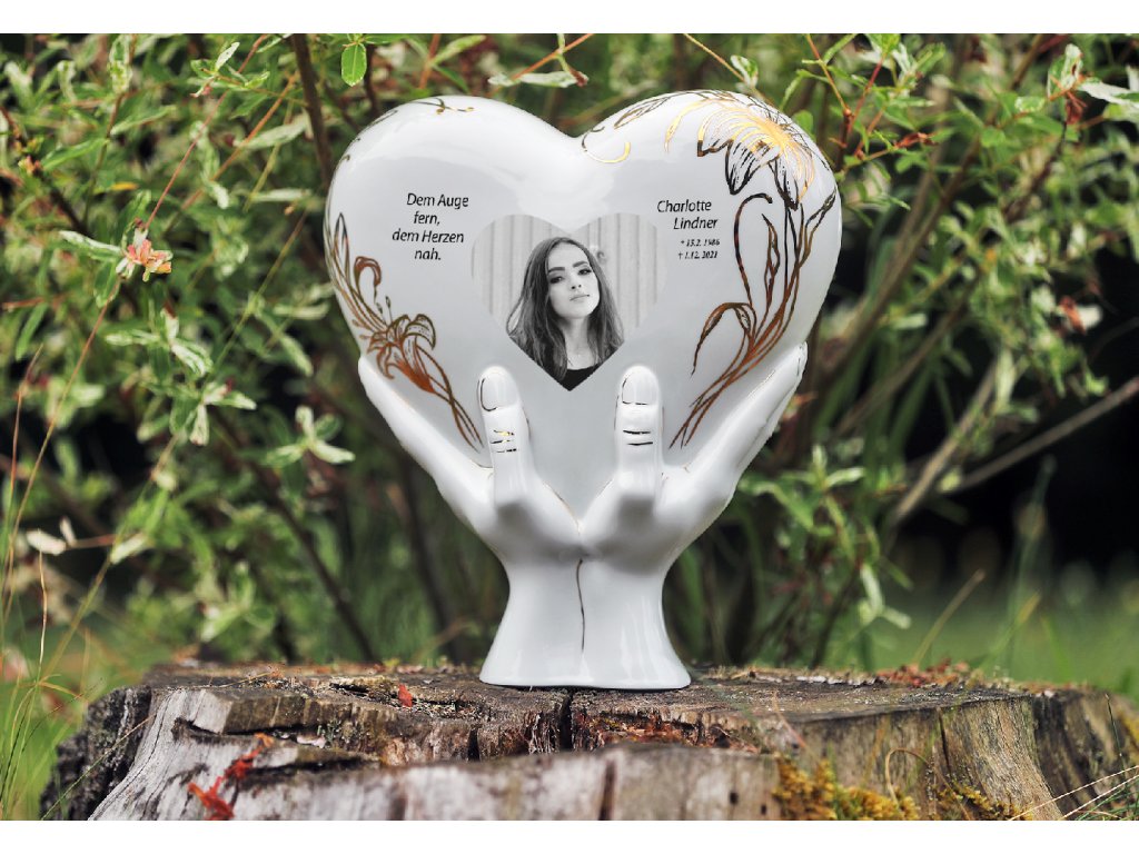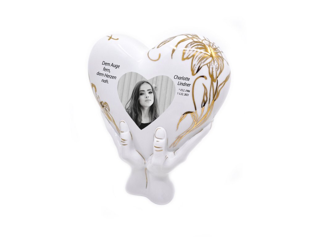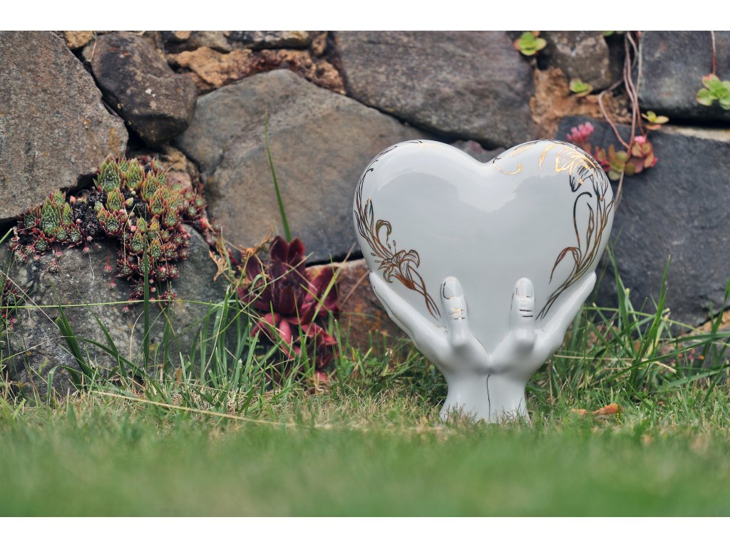 Stilvolle Bestattungsurne Herz in menschlichen Händen.